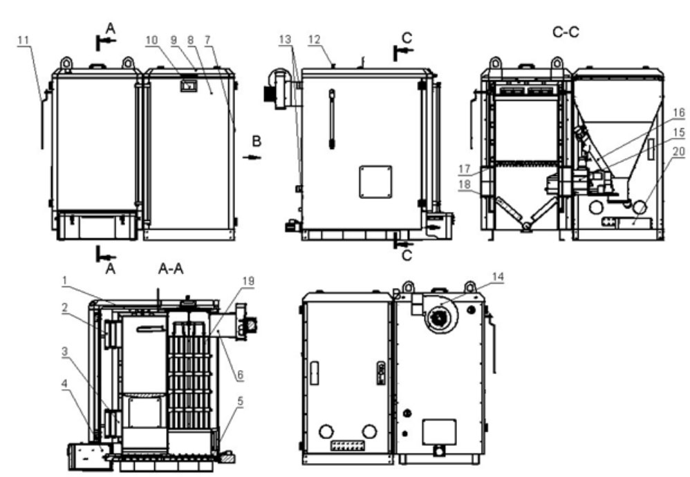 По необхідності бункер та пальник можна розташувати як злівої так і з правої сторони котла. Бункер має достатньо великий об’єм, що дає можливість не досипати паливо на протязі 4-6 днів.